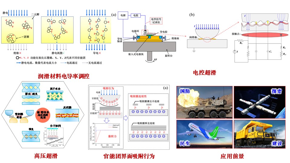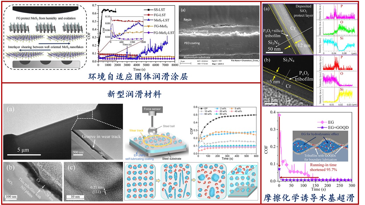 研制特种润滑材料,实现轮毂电机轴承等关键零部件运行条件下有效润滑减摩;揭示物化耦合的电场润滑机理,进而在宏观电场环境实现超滑。开展环境自适应固体润滑涂层设计及超滑机理研究、环境友好型水基润滑材料制备及摩擦磨损机理研究、宏观摩擦界面结构调控诱导的超低摩擦磨损研究。