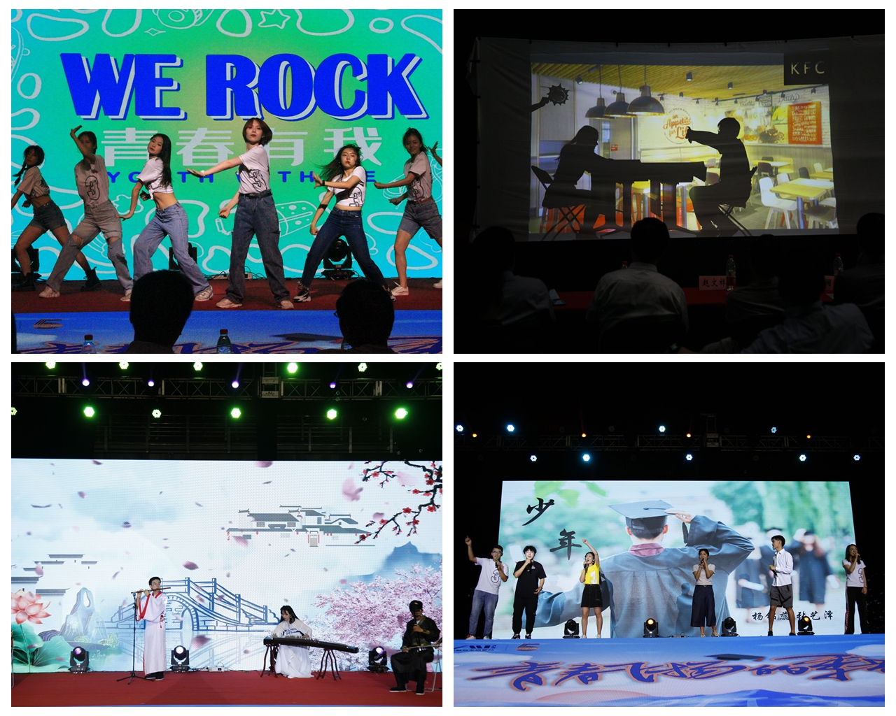 在“青春岁月,北理时光”篇章,有学生舞团带来的精彩舞蹈《We Rock》,点燃了全场的气氛,展现了同学们青春的活力朝气与昂扬的精神面貌;接下来由车辆三班的本科生们带来的情景剧《北理影画》,更是通过一幕幕经典的学习和生活场景带我们重拾了四年的回忆;机械二班四位同学充满古韵的器乐合奏《起风了》,展现了学子的青春活力朝气与这首歌曲传递出的无惧风吹雨打只要砥砺前行的信心;歌曲串烧《毕业歌》表达了毕业生对母校的依依不舍,又带着对同学、朋友美好未来的浓浓祝福。青春活泼的互动抽奖环节赋予了晚会如火的热情,舞蹈《YesOK》、《TakeMeDown》、乐队演出《乐队》和歌曲《OnlytheYoung》将现场氛围推向了高潮。晚会在师生合唱《老男孩》中落下了帷幕,嘉宾、老师和全体演职人员的合照为精彩的晚会留下了珍惜的回忆。此次晚会设计匠心独运,节目数量丰富、种类繁多,演职人员涵盖了学院教师、毕业年级本科生与研究生,充分展现了三院师生的风采、和谐团结的学院文化。
