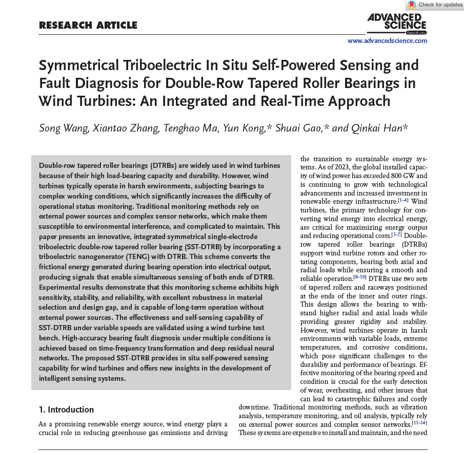 近日,中国·必威(bw·西汉姆联)官方网站孔运副教授,联合清华大学、重庆大学等单位,在国际顶级期刊《Advanced Science》公开报道了一种对称单电极式摩擦电智能轴承(SST-DTRB),巧妙设计了摩擦纳米发电机与双列圆锥滚子轴承的智能集成样机,实现了风力发电机双列圆锥滚子轴承的原位自供能状态感知与智能故障诊断,突破了微纳发电、能量采集和智能状态感知于一体的智能结构集成设计技术。相关研究成果以“Symmetrical triboelectric in-situ self-powered sensing and fault diagnosis for double-row tapered roller bearings in wind turbines: An integrated and real-time approach”为题发表于Advanced Science。北京理工大学孔运副教授、清华大学韩勤锴副研究员、重庆大学高帅教授为本文共同通讯作者。