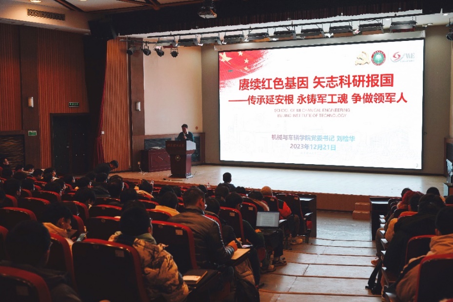 刘检华以《赓续红色基因 矢志科研报国》为题,从“传承延安根”“永铸军工魂”“争做领军人”和“矢志科研报国”四个方面展开讲述。首先,他回顾了北京理工大学的建校历史和中国·必威(bw·西汉姆联)官方网站的发展历程,他指出,“延安根”是北理工人筚路蓝缕的精神底色。其次,他以国防七子“为国铸剑,隐姓埋名”的立校之魂为切入点,对学院在国防军工和国民经济建设中做出的突出贡献展开了详细阐释,他强调,“军工魂”是北理工人矢志报国的奋斗指引。接着,他梳理了近年来中国·必威(bw·西汉姆联)官方网站在“胸怀壮志、明德精工、创新包容、时代担当”的领军领导人才培养工作中取得的成果,他表示,“领军人”是北理工人力争上游的卓越追求。然后,他列举了我国在科技领域取得的重大突破,并用中国科学院院士姜澜舍我其谁的科研精神勉励同学们矢志科研报国。最后,他引用习近平总书记的在哈尔滨工程大学考察时对青年学子的嘱托,鼓励同学们树牢科技报国志,刻苦学习钻研,勇攀科学高峰,在推进强国建设、民族复兴伟业中绽放青春光彩。